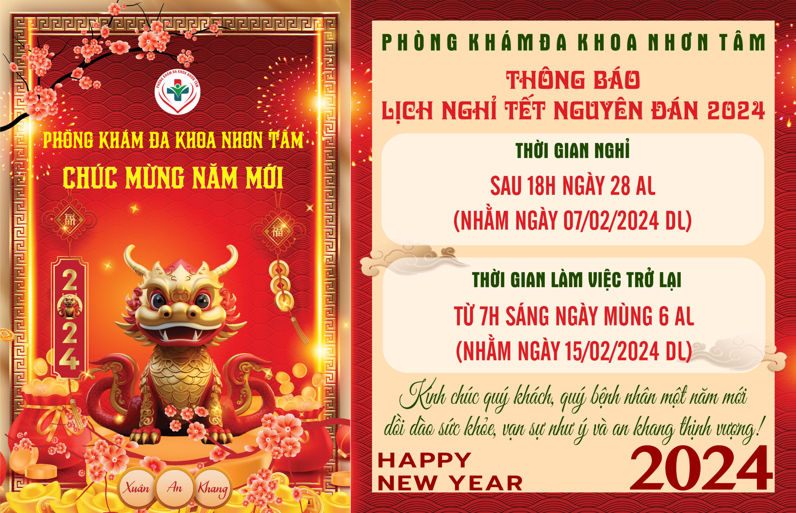 Phòng Khám Đa KHoa Nhơn Tâm thông báo lịch nghỉ tết Nguyên đán 2024 Thời gian nghỉ: 7 ngày Từ ngày 08/02/2024 đến hết ngày