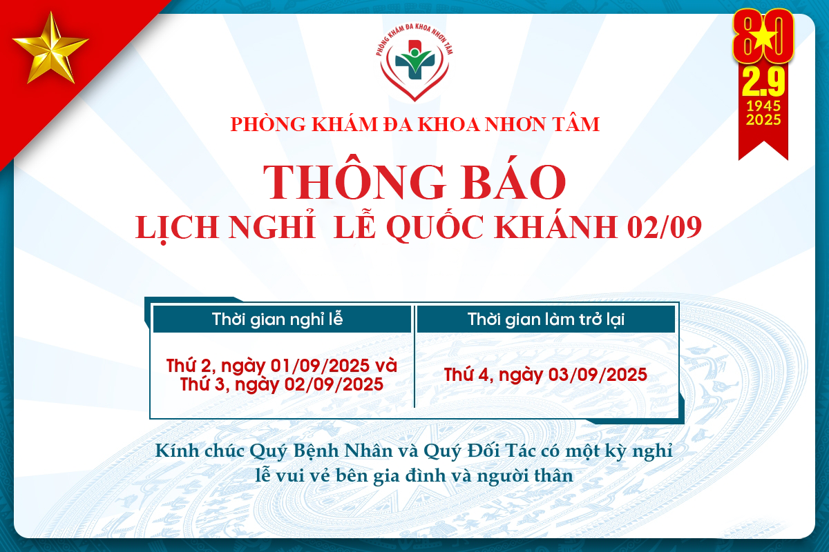 📢 PHÒNG KHÁM ĐA KHOA NHƠN TÂM – THÔNG BÁO NGHỈ LỄ QUỐC KHÁNH 02/09 Kính gửi Quý bệnh nhân và Quý đối tác, Phòng khám